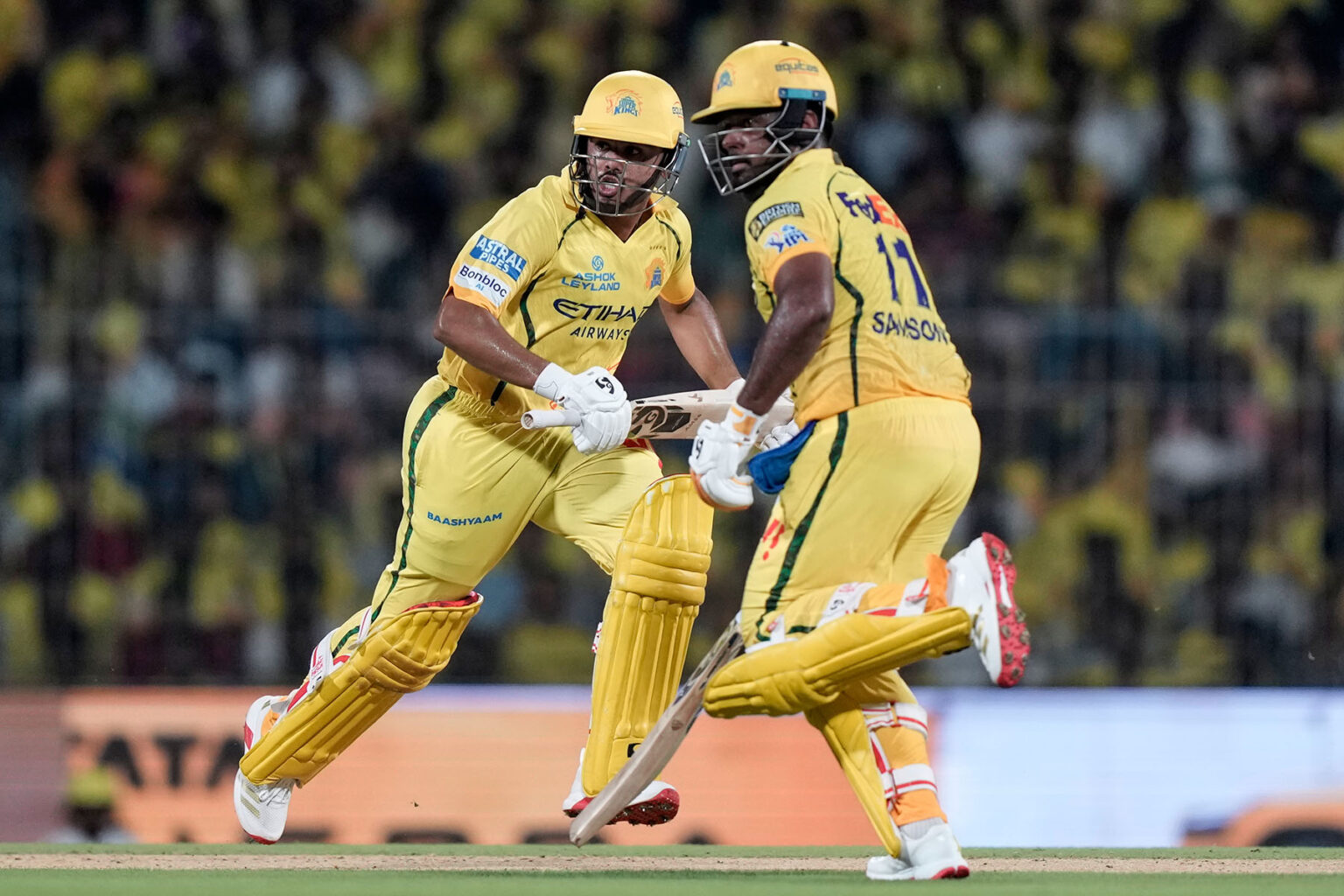 Chennai Super Kings' Ayush Mhatre, left and Sanju Samson run between the wickets to score during the Indian Premier League cricket match between Chennai Super Kings and Delhi Capitals in Chennai, India, Saturday, April 11, 2026. (AP Photo/Mahesh Kumar A.)